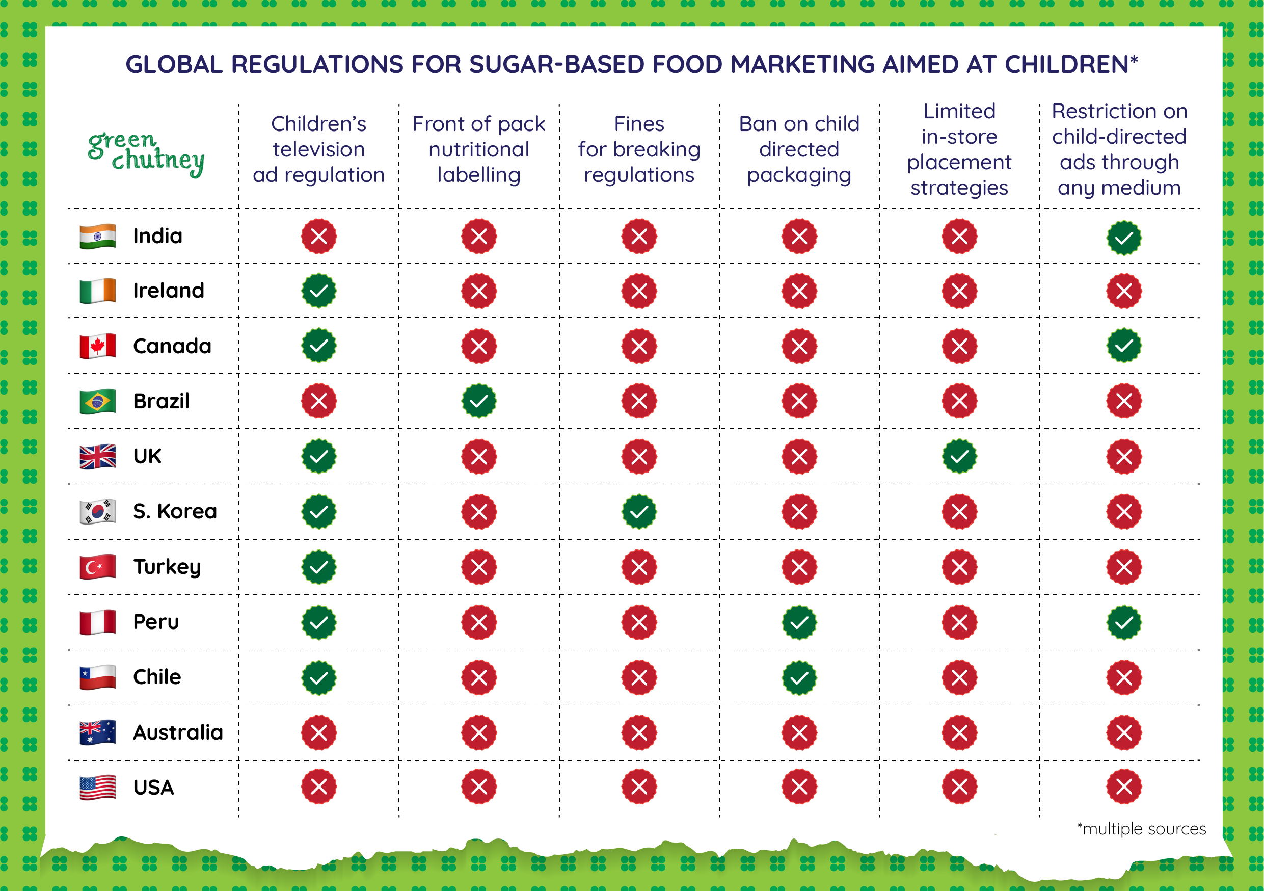 Table 1: Global regulations for HFSS food marketing aimed at children. Multiple sources.